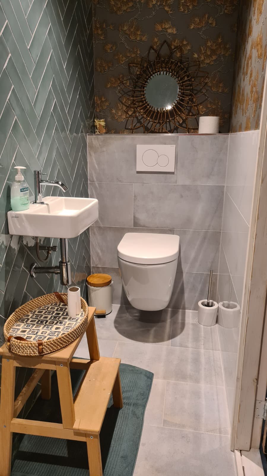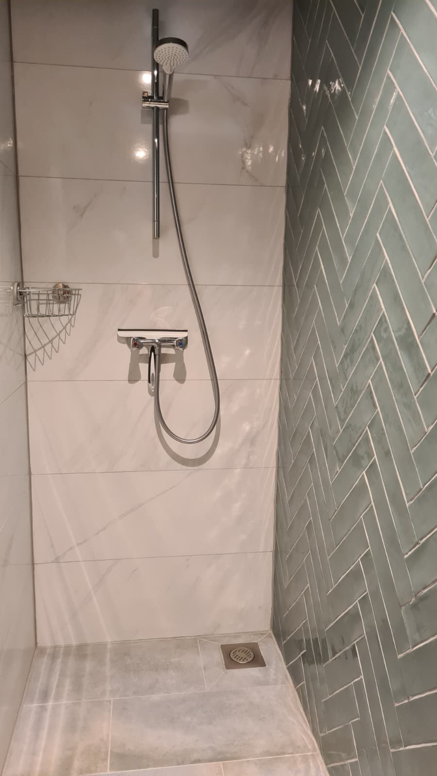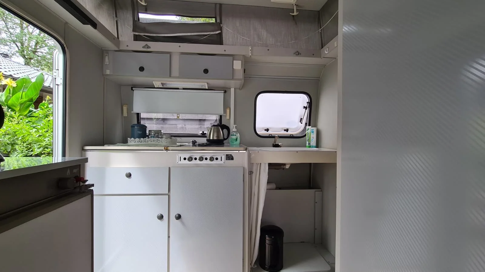 De badkamer en kitchenette bevinden zich in de naastgelegen ruimte.