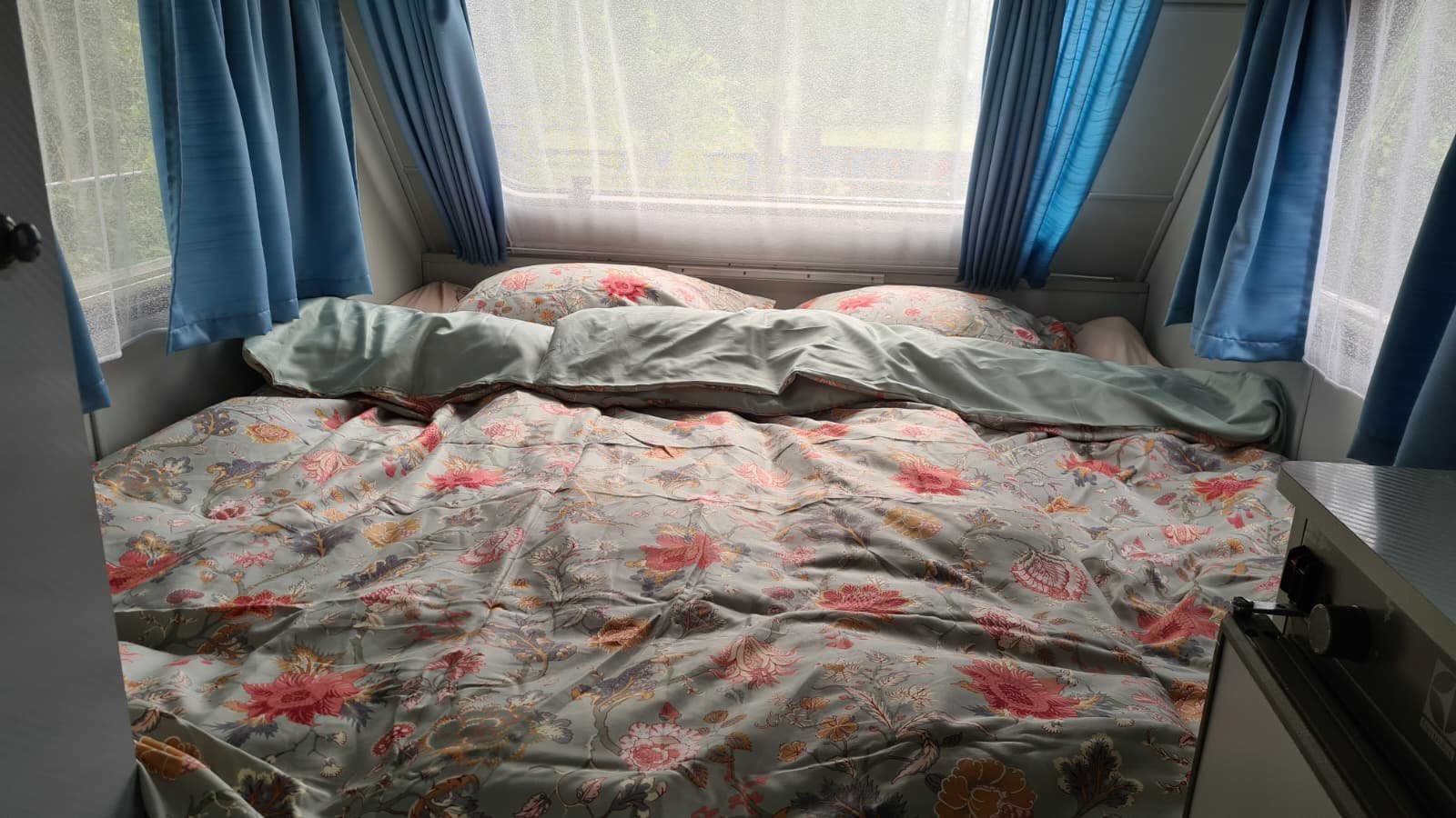 In het zomerseizoen is er een knusse retro Kipcaravan met een breed bed beschikbaar.