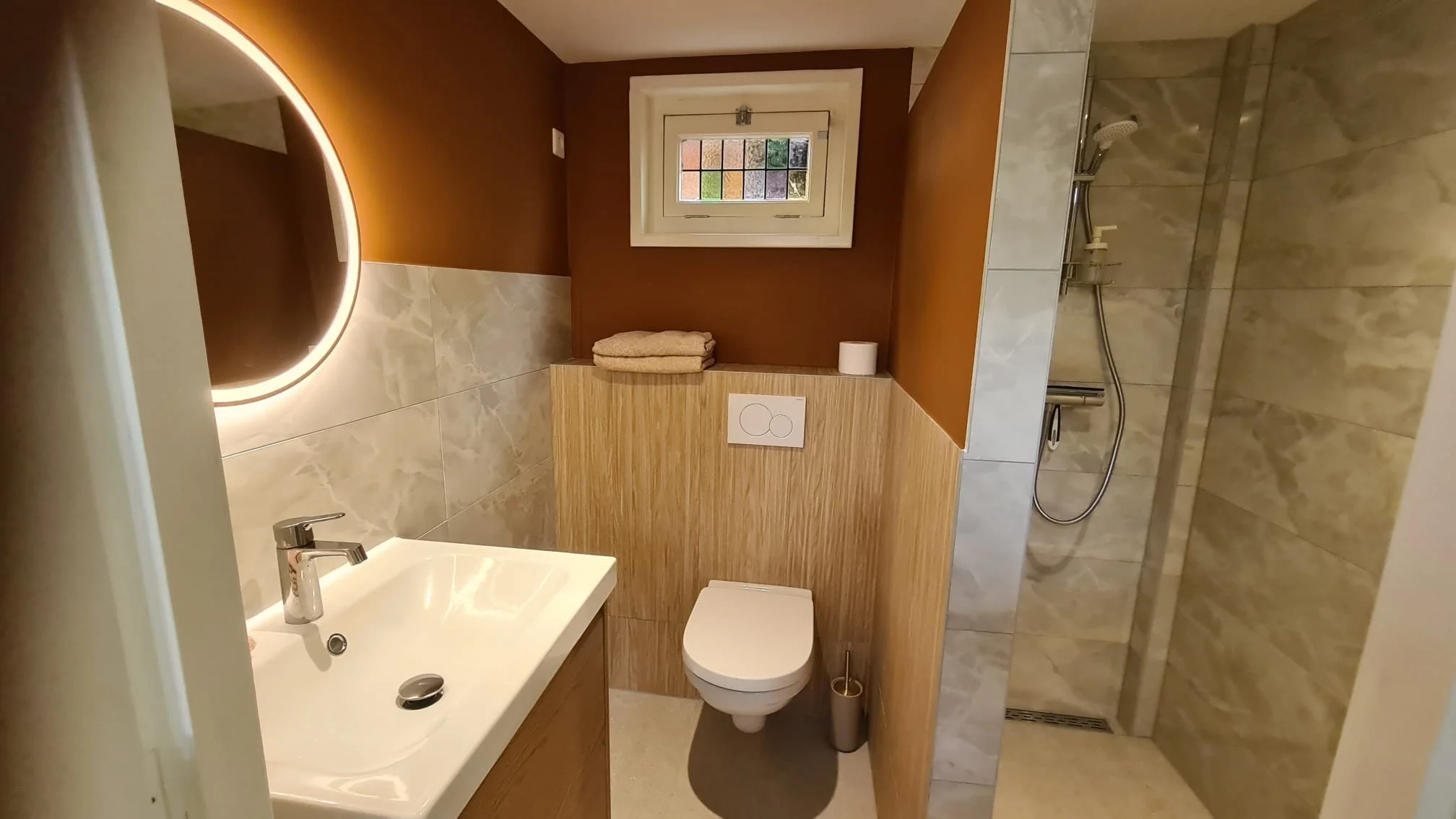 De studio heeft een oppervakte van 30m2, een heel comfortabel Auping queen-size bed, een keuken met kookplaat, magnetron en koelkast. Er is een complete ruime badkamer.